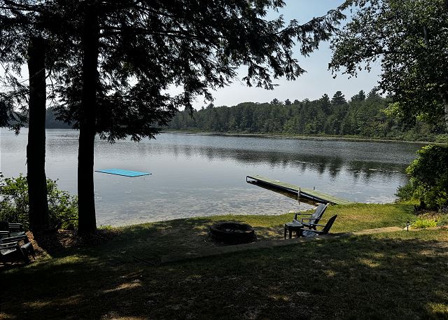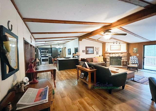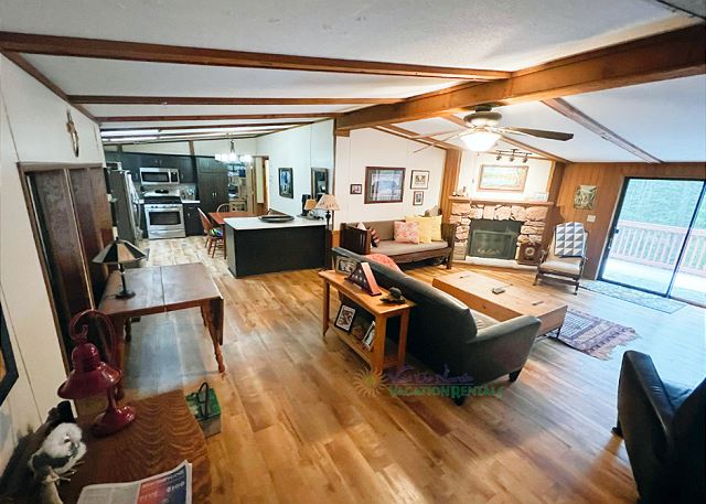 The spacious well-lit living room has plenty of seating, a flat-screen TV, and access to the large, beautiful, wrap-around deck for relaxation. Just steps away, you have private access to your fire pit right off the shore of Bass Lake.
