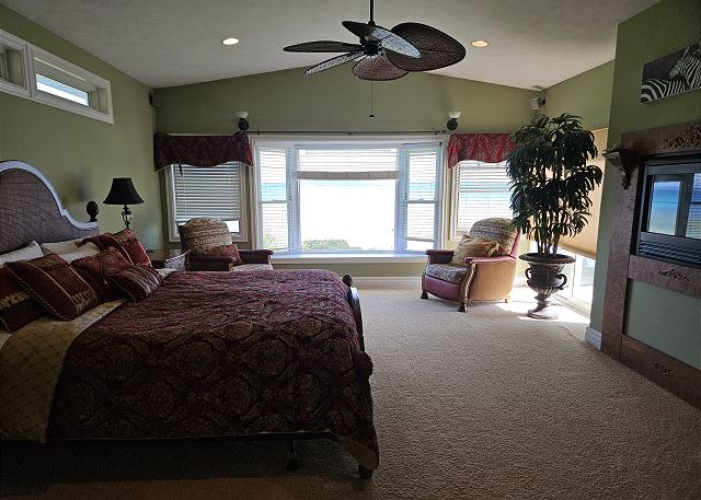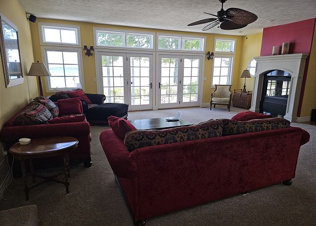 Living area with French doors to beautiful deck and bay, gas fireplace, WIFI, Netflix, Blu-Ray player. -
