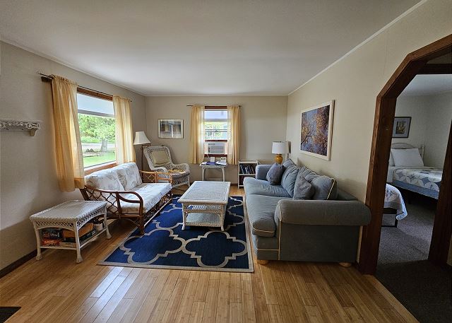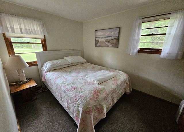 This cabin has one queen, two twins, and a sofa bed. It has a full kitchen (no dishwasher), a charcoal grill, and a picnic table. There is WIFI. There is no TV, no phone, and no worries at this peaceful location, only minutes from the village of Glen Arbor. Pickleball and volleyball are available.