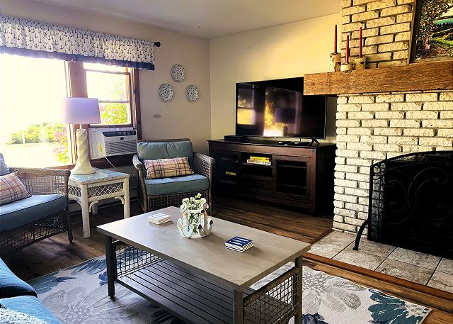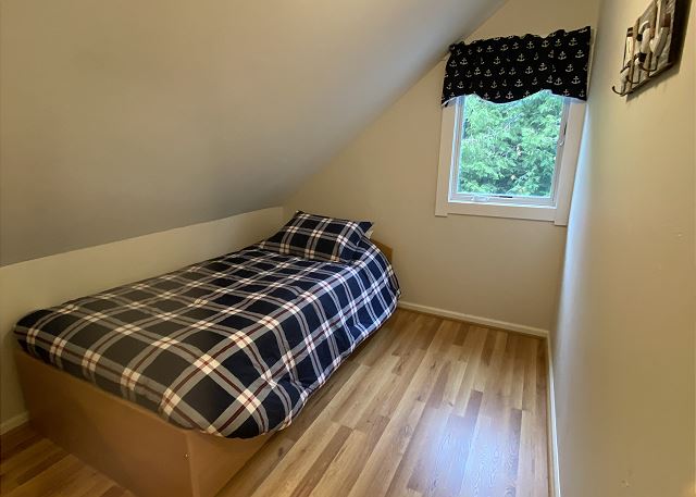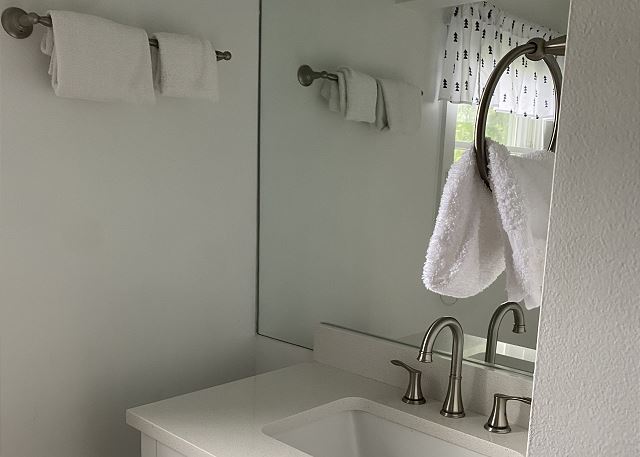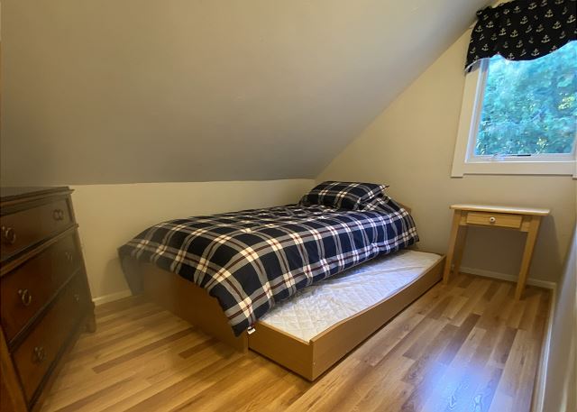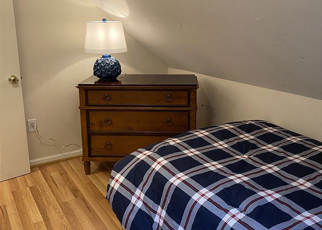 One bedroom is located on the main level and three bedrooms are on the upper level; the bedrooms provide 1-king bed, 2-queen beds, 1-twin, and a trundle. All bed linens and towels are included. There are ceiling fans in the bedrooms and window air conditioners in some rooms as well. There is one in an upstairs bedroom, dining room, and in the lower bedroom.