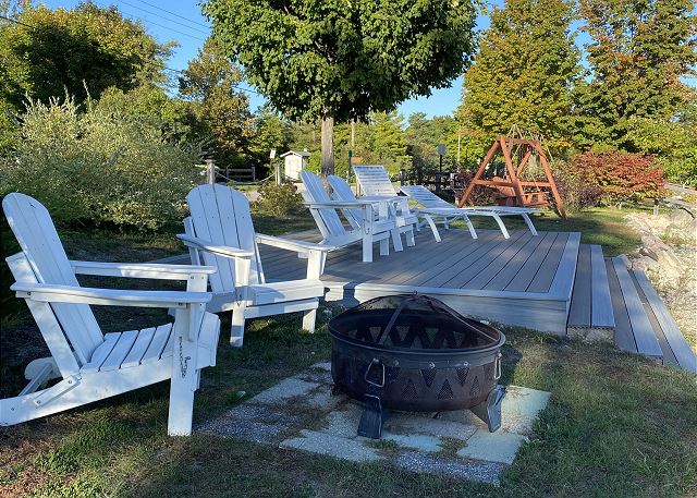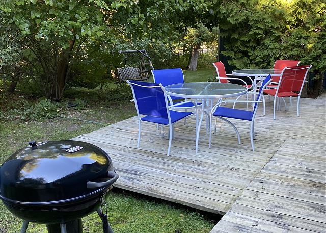 OUTDOORS: deck/patio, lawn/garden, grill, waterfront, beach chairs, porch, outdoor dining table & chairs, swing set
