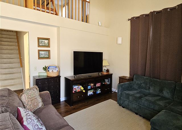 The inviting living room is tastefully furnished and complemented by a wood-burning fireplace, perfect for cozy evenings. Outside, guests can enjoy a porch at the back of the house, as well as a quaint deck upstairs with seating for four.
