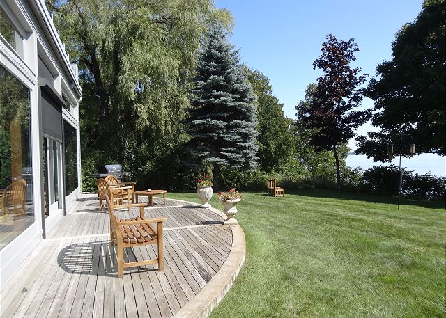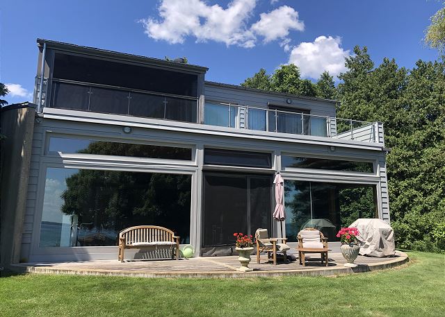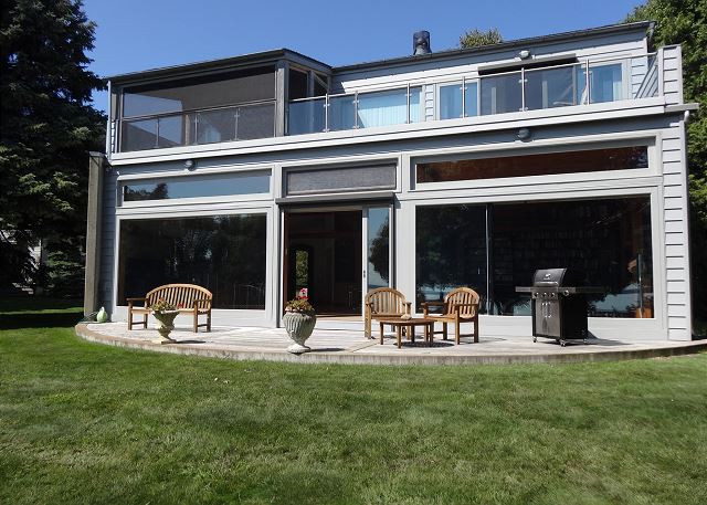 This unique and stunning, two-story architectural gem was designed to take full advantage of the natural setting on West Grand Traverse Bay. It has been featured in numerous design magazines and on HGTV. The spacious accommodations offer stunning bay views from almost every point in the house.